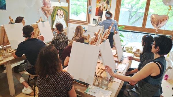 Alles, was Sie brauchen, bringen wir mit: Leinwände, Farben, Pinsel, Schürzen, Zubehör.